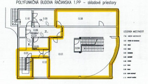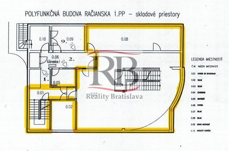 Ponúkame na prenájom skladový priestor v suteréne administratívnej budovy na Račianskej ulici v Novom Meste – Bratislava 3, neďaleko OD Slimák alebo Figara. V celej budove sú použité kvalitné materiály. Všetky priestory sú vybavené PC štruktúrovanou kabelážou, klimatizáciou, s vlastnými meradlami el. energie, vstup čipovými kartami. Objekt je zabezpečený vlastným bezpečnostným systémom, a tiež každý priestor je vybavený vlastným alarmom, DSS linky a aj možnosť napojenia na optický kábel v budove.