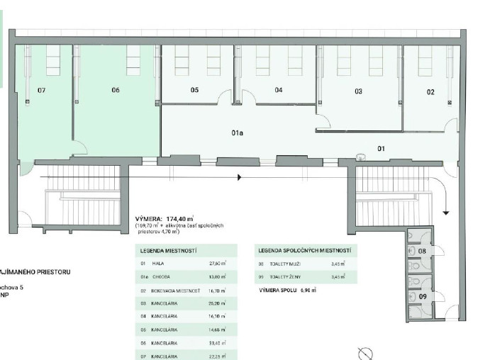 K dispozícií sú priestory na 4.NP o celkovej výmere 174,40 m2. Dispozične sa delia na halu, chodbu a 6 samostatných kancelárií.