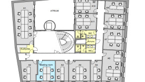 Office A2 (kapacita 2 miesta), 21,02m2 vr. podielu. CENA nájmu vr. energií, internetu a DPH = 450€/mesiac.