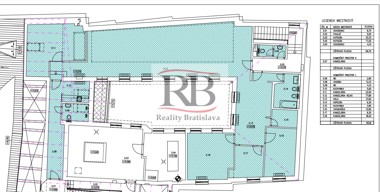 K dispozícii je celok na poslednom 4.poschodí o celkovej ploche 193,8m². (Prístup výťahom je iba po 3.poschodie! z 3. poschodia je prístup do priestorov iba po schodoch).