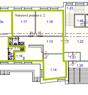 Priestor o celkovej ploche 93,6m2 sa nachádza na vyvýšenom prízemí a disponuje samostatným vstupom nachádzajúcim sa pri recepcií budovy. Dispozične sa delí na vstup/halu s časťou pre kuchynku a 3 samostatné kancelárie + sociálne zariadenie. Priestor má presklený výklad orientovaný na Záhradnícku ulicu.