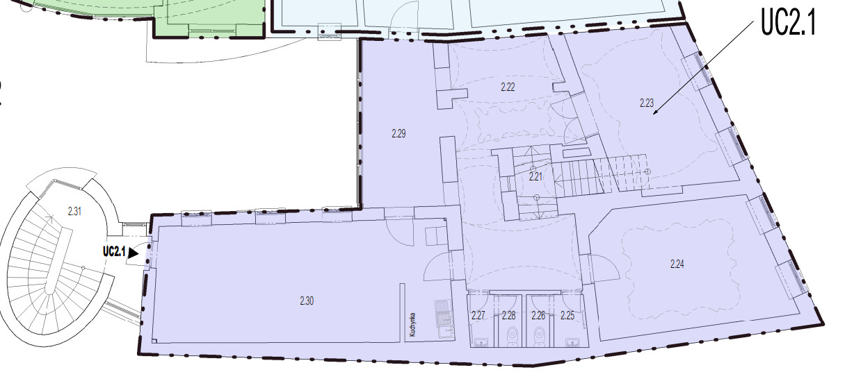 2.NP: 144,96m2 ucelený celok 3 kancelárií s vlastnou kuchynkou a delenými toaletami priamo v priestore.