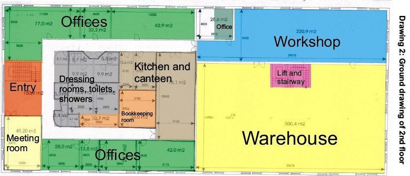 Priestory sa nachádzajú v 2-poschodovej budove s celkovou výmerou 4 000 m²: