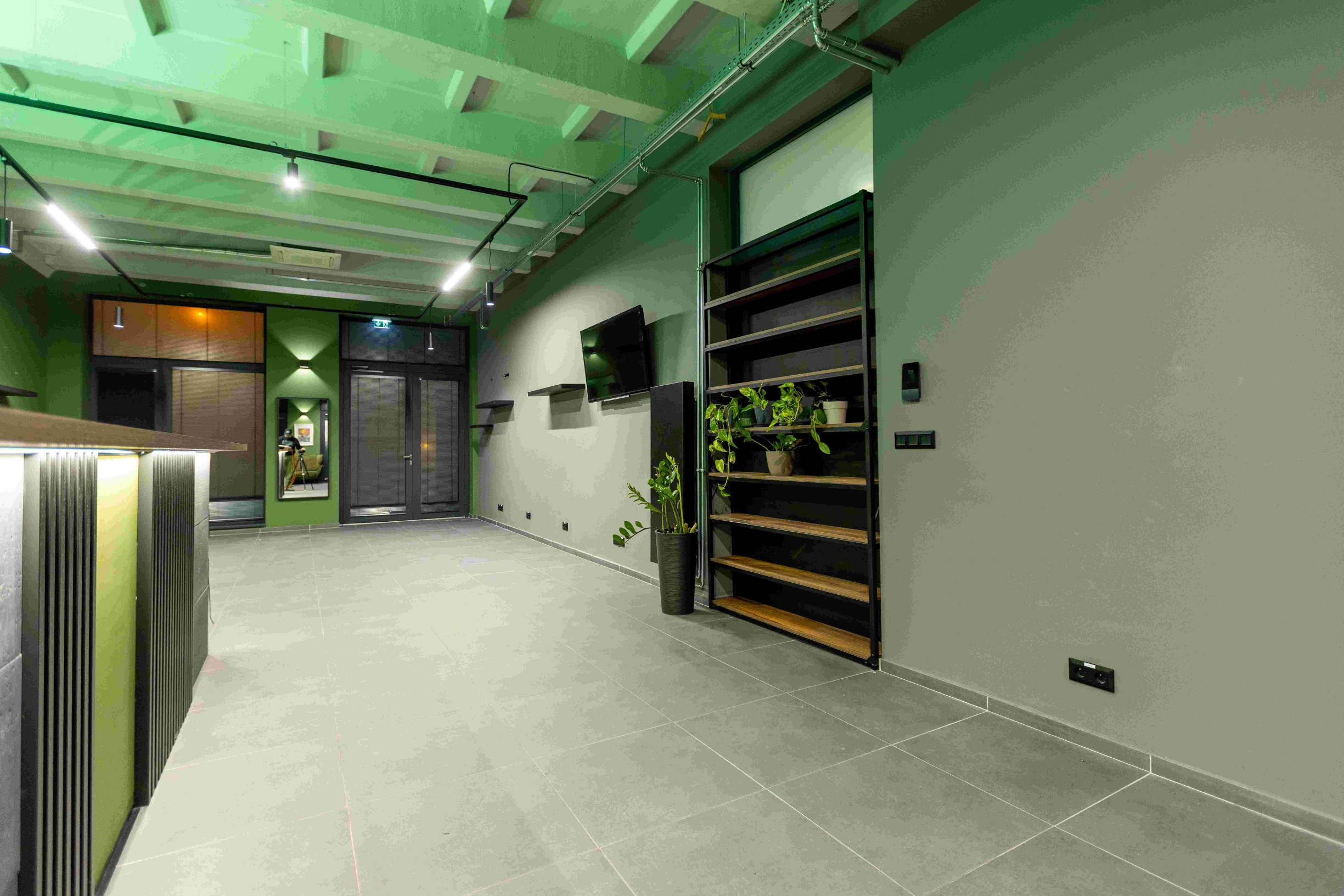 Priestor disponuje vysokými stropmi, 2 vstupmi a veľkými výkladmi orientovanými na dve strany.