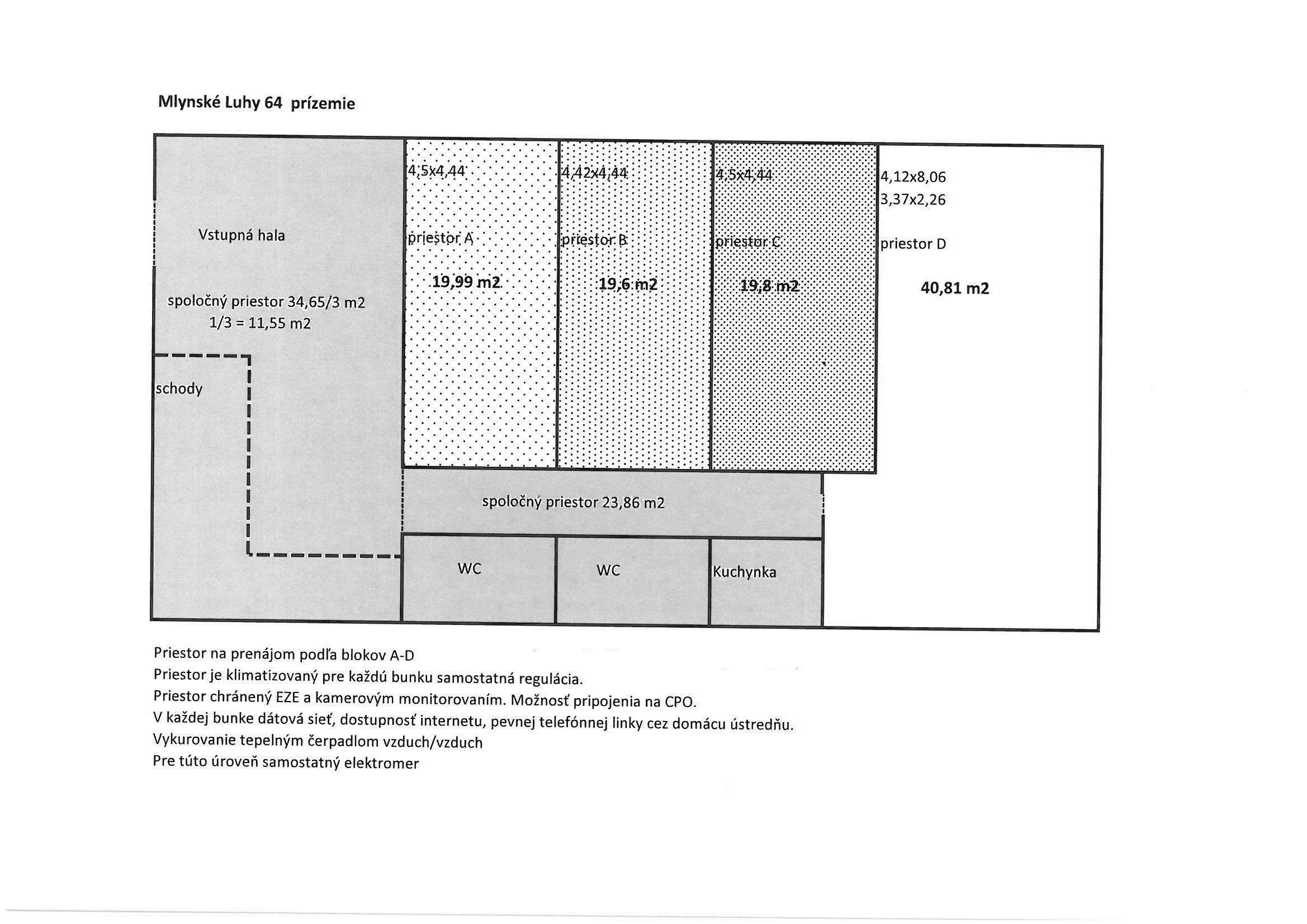 Celková výmera 135 m2 ponúka 4 samostatné miestnosti (3 x 20 m2 a 1 x 40 m2), dve toalety a kuchynku. Priestory sú kúrené aj chladené cez stropné fancoily (každá miestnosť má zvlášť reguláciu), dátové siete v každej miestnosti.
