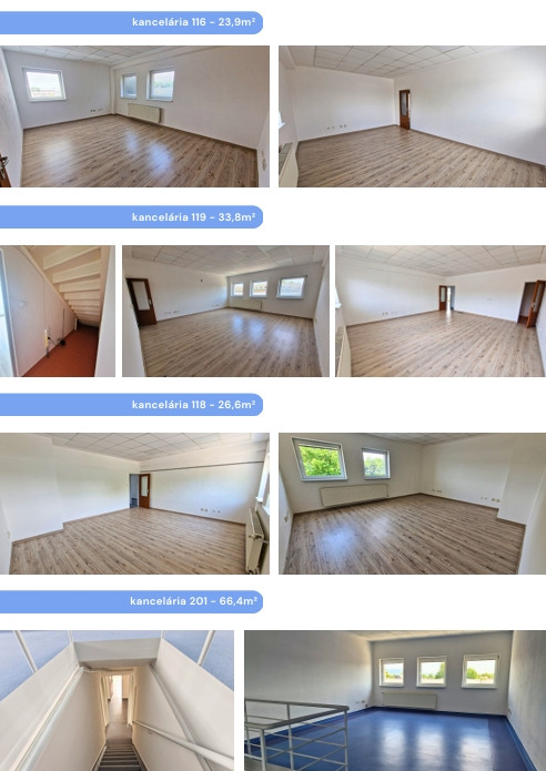Kancelárie v celkovej výmere 234m2 viď. príloha, majú bonus komfortnosti v samostatnom vstupe, parkovanie pred budovou, stravovanie v rámci areálu (raňajky, obedy), autobusová zastávka v blízkosti objektu.